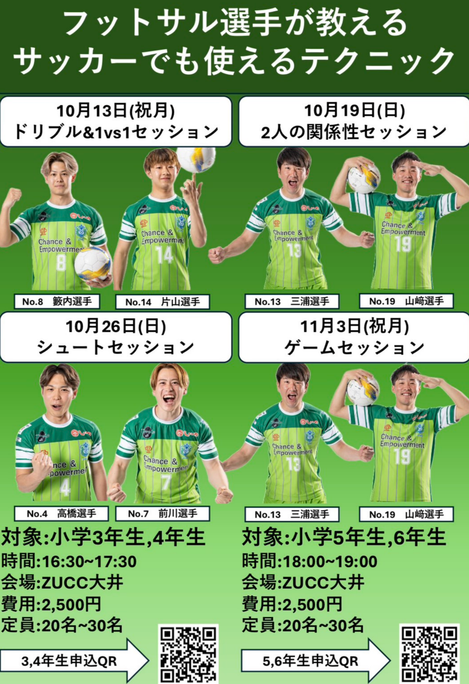 今回クラブのトップチームにあたる湘南ベルマーレフットサルクラブから選手を招き「フットサル選手が教える、サッカーでも使えるテクニック」をテーマに下記の4つのセッションを実施いたします!